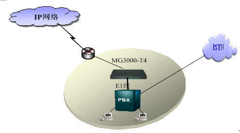 MG3000-T4提供1、2、4E1中繼,直接提供數(shù)字中繼口和PBX交換機(jī)對接,PBX交換機(jī)原有的撥號習(xí)慣和撥號方式不做改變,可以通過路由選擇的方式來走原來的PSTN網(wǎng)絡(luò)或者IP網(wǎng)絡(luò),同時(shí)通過MG3000-T4來做電路交換和IP網(wǎng)的分組交換的轉(zhuǎn)換,實(shí)現(xiàn)該分支機(jī)構(gòu)和其他分支機(jī)構(gòu)的互連互通。
