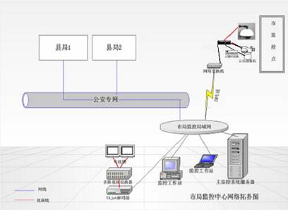 網(wǎng)絡(luò)視頻服務(wù)器對前端監(jiān)控點(diǎn)攝像機(jī)采集的視頻信號進(jìn)行編碼壓縮處理后,通過2M專線上傳到市公安局監(jiān)控中心。