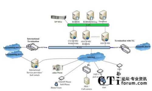 計費系統(tǒng)將把視頻通話和普通的語音通話分開來計費,視頻會議業(yè)務(wù)也可以作為一項特殊業(yè)務(wù)單獨計費。所有這些業(yè)務(wù)都使用相同的計費和OAM系統(tǒng)。在這個運營商級軟交換系統(tǒng)中,已經(jīng)把視頻業(yè)務(wù)完全集成進了系統(tǒng)。下面是網(wǎng)絡(luò)示意圖: