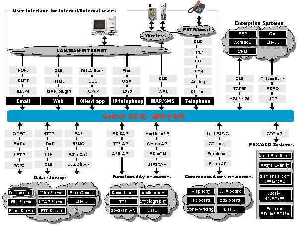 UC統(tǒng)一通信平臺是通信開發(fā)平臺的世界領(lǐng)先者, 提供功能強(qiáng)大而又迅速的開發(fā)技術(shù)來建立復(fù)雜的企業(yè)通信服務(wù)。這些技術(shù)包括CTI,傳真,數(shù)據(jù)通信,電子郵件,VXML, HTML,ASR,TTS, WAP,數(shù)據(jù)庫接入等。標(biāo)準(zhǔn)接口讓我們方便的與企業(yè)CRM、ERP、OA等系統(tǒng)連接。