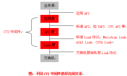 API層產(chǎn)品:實(shí)現(xiàn)把標(biāo)準(zhǔn)Link協(xié)議轉(zhuǎn)化為標(biāo)準(zhǔn)的API,如CTC API、TAPI、JTAPI等,為CTI應(yīng)用開發(fā)提供一套標(biāo)準(zhǔn)的API,屏蔽了不同交換機(jī)擁有的CTI協(xié)議和CTI接口,使應(yīng)用程序員無需關(guān)心消息是如何在計(jì)算機(jī)和交換機(jī)之間傳遞,專注于客戶端的應(yīng)用開發(fā),實(shí)現(xiàn)應(yīng)用程序與交換機(jī)平臺(tái)無關(guān)性。