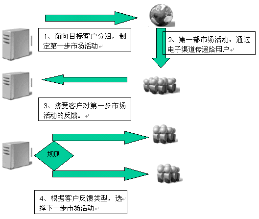 電子化營銷過程,是通常是多步驟市場活動。每個步驟完成一定的工作,下一步的市場活動將根據(jù)客戶對市場活動的反饋和內(nèi)置的市場活動的規(guī)則進行選擇。而且每個步驟客戶市場活動的反饋,都由電子化營銷系統(tǒng)中的反饋處理系統(tǒng)集中到CRM系統(tǒng)中。從而為市場活動效果評估,提供數(shù)據(jù)上的支持。
