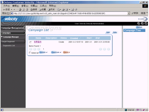 易虹德龍(Delano),所提供的Custoemr Velocity滿足了CRM用戶在電子營銷方面的需求。在這個(gè)平臺上,CRM系統(tǒng)用戶,可以通過WEB界面,輕松地針對客戶分組制定和管理所有市場活動。這些市場活動,通過多個(gè)步驟一步一步地抓住客戶的“心”。下圖是使用易虹解決方案進(jìn)行活動管理的界面: