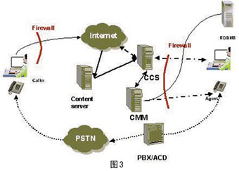 ----圖2說明了在集成互聯(lián)網(wǎng)電話網(wǎng)關時進行協(xié)同會話的流程,圖中實線為數(shù)據(jù)信息傳遞的鏈路,虛線為語音傳遞的鏈路。通過ITG和PBX/ACD 的特定交互接口,將呼叫中心外部的IP電話鏈路集成到CCIS系統(tǒng)中。值得注意的是,ITG 和CCS需要安裝在企業(yè)防火墻的外側,以方便呼叫者的訪問。