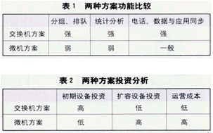 一般來(lái)說(shuō),最能影響呼叫中心運(yùn)行能力的功能特征有3個(gè)方面:分組排隊(duì)功能、統(tǒng)計(jì)分析功能以及電話、數(shù)據(jù)與應(yīng)用的同步功能。上述兩種方案比較列于表1和表2。