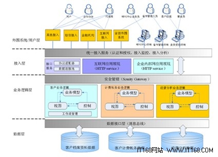 其中,外圍系統(tǒng)/用戶(hù)層主要指系統(tǒng)相關(guān)的外圍系統(tǒng),以及業(yè)務(wù)受理、系統(tǒng)管理、綜合查詢(xún)、繳費(fèi)、統(tǒng)計(jì)報(bào)表、帳務(wù)管理等與客戶(hù)或操作人員交互的應(yīng)用系統(tǒng)界面。接入層為最終客戶(hù)提供統(tǒng)一的客戶(hù)接觸、服務(wù)平臺(tái),為各個(gè)營(yíng)銷(xiāo)渠道服務(wù)人員提供良好的工作平臺(tái),支撐其為客戶(hù)提供優(yōu)質(zhì)服務(wù),同時(shí)為其它外圍系統(tǒng)和機(jī)構(gòu)提供實(shí)時(shí)、定時(shí)批處理接口。業(yè)務(wù)邏輯層(應(yīng)用層)是系統(tǒng)的最核心部分,它接收來(lái)自表現(xiàn)層的功能請(qǐng)求,是實(shí)現(xiàn)各種業(yè)務(wù)功能的邏輯實(shí)體,如業(yè)務(wù)受理中的業(yè)務(wù)新裝、開(kāi)/停機(jī)、業(yè)務(wù)變更以及話(huà)費(fèi)查詢(xún)、報(bào)表統(tǒng)計(jì)計(jì)算等。數(shù)據(jù)層用于存放并管理各種系統(tǒng)數(shù)據(jù),如客戶(hù)資料數(shù)據(jù)、資源數(shù)據(jù)、銷(xiāo)售數(shù)據(jù)、統(tǒng)計(jì)分析數(shù)據(jù)等。