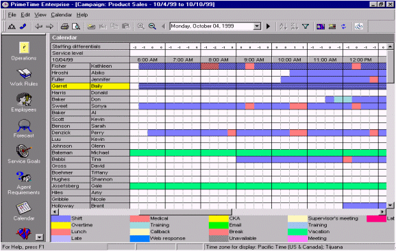 人員預(yù)測(cè)是一個(gè)每天、每周、每月、每年都需要作的工作計(jì)劃,為了能夠平衡呼叫中心人員的工作量和人員的可用性。通過(guò)將歷史數(shù)據(jù)和人員數(shù)據(jù)整合、加以分析,并借以WFMS體現(xiàn)出分配多少員工就可以達(dá)到既定的服務(wù)水準(zhǔn)。一旦需要員工數(shù)量被估算出來(lái),那么工作安排也就是每天、每周、每月、每天的排班表的輪廓也就出來(lái)了。絕大多數(shù)的WFMS軟件的界面和操作都很相似,最主要的就是內(nèi)容就是要包含員工的姓名、員工的工作時(shí)間、員工的其他日程(最小單位是15分鐘),并且能夠提供具有多個(gè)管理軟件接口,和多種不同的管理方式。圖9.就是一個(gè)典型的人員排班表,以15分鐘為單位體現(xiàn)人員的工作安排。附加選項(xiàng)還可以包含"休假""遲到""曠工"等等,并且這排班表還可以通過(guò)歷史數(shù)據(jù)體現(xiàn)出哪個(gè)時(shí)段可能出現(xiàn)人員不足哪個(gè)時(shí)段容易出現(xiàn)人員過(guò),F(xiàn)象。