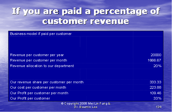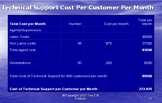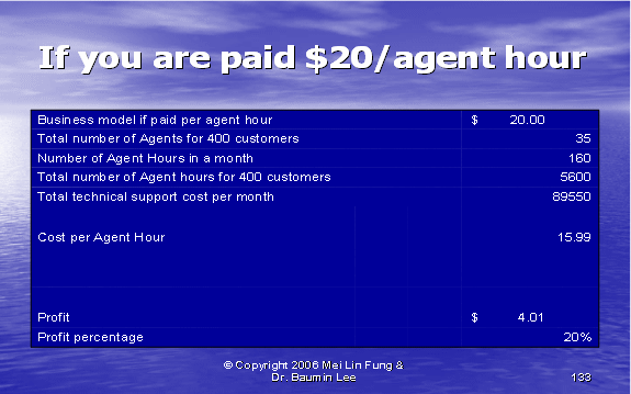 根據圖表12,我們可以算出第二種方式的利潤百分比。如果我們假設每個客戶每年的收入是20,000美元,其中分配給呼叫中心部門的收入是20%。我們每個客戶每月的收入是333.33美元,每個客戶月的成本是223.88美元(參見圖表10)。這導致我們來自每個客戶每月的利潤是109.46美元——這將產生33%的利潤率。