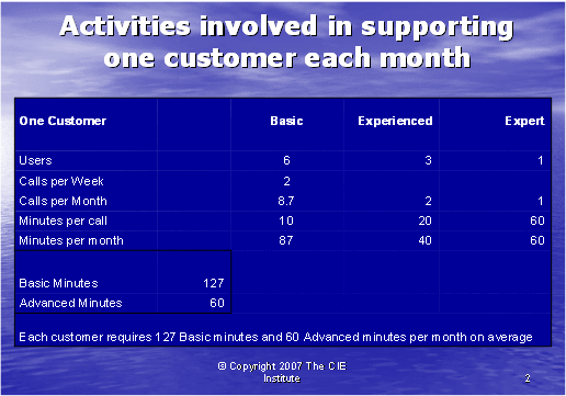 圖表1為我們提供了重要的信息,有助于我們計算一般的客戶在基礎和高級兩種技術支持中所需的技術支持的通話時長。我們需要區(qū)分這兩種技術支持,因為提供高級技術支持的座席的月薪是2000美元,比提供基礎技術支持,月薪為1000美元的座席每月所花的成本要高。那么,面臨有經驗的客戶使用者時該怎么做呢?因為只有專業(yè)客戶使用者才能要求高級座席支持,所以他們的需要似乎可以由與初級客戶使用者打交道的基礎座席處理。