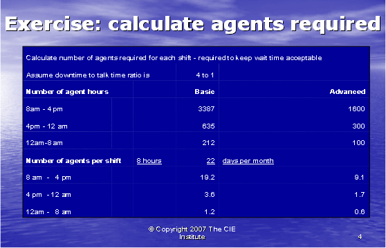 在我們計算出所需的座席數之前,我們必須了解一個座席的付薪工作時間和他的通話時長的區(qū)別,通話時長是座席真正花在電話上面對客戶的時間。一個座席不會一直處理電話,其它的時間用于培訓,休息,與主管獨處,部門會議,公司內部為給客戶提供準確的回答而進行研究,對內對外寫郵件,準備下一個客戶的電話。在每個呼叫中心中,通話時長和停工時長的比率是不同的。對于復雜易變的產品,花在培訓上的時間會更多。在新產品被頻繁介紹的呼叫中心,就需要更多的時間去研究關于新產品的回答。為了更精確,一個座席一周的工作時長應該與其通話時長相比較,以便真正確定通話時長與停工時長的比率。在我們的例子中,我們假設停工時長和通話時長的比率為4:1,也就是說,每1小時通話時間,相對應4小時停工時間。