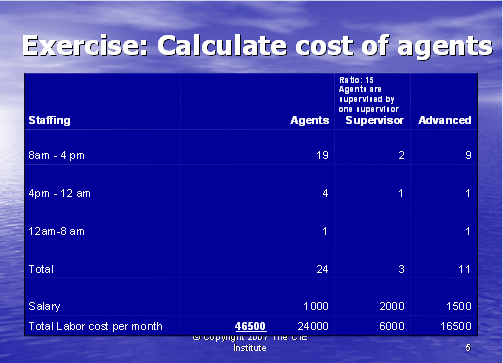 我們下一步就是計算出主管的成本。每次排班至少需要一個主管,如果這一排班的座席數要少一些,主管則也應該能夠處理一些技術支持的電話。在這個例子中,我們將假設主管擁有高級支持座席的技術技巧。在圖表5中,你將看到我們使用了圖表4所得出的座席數,并假設這是每次排班話務量中所需的各種類型員工的數量:基礎,高級和主管。我們同時用圖表1中的薪資去計算座席和主管支持400個客戶的總成本。通過把每種座席單獨的成本相加(24個基礎座席,11個高級座席和3個主管),得出每月的人工成本為46,500美元。