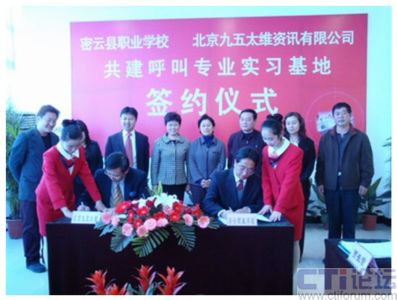 12月18日上午,密云縣職業(yè)學校與北京九五太維資訊有限公司校企合作共建呼叫專業(yè)實習基地簽約儀式在密云縣職業(yè)學校隆重舉行,市教委職成處處長李敏,縣委常委副縣長王春林、副縣長錢福生、副縣長徐芳出席簽約儀式并發(fā)表了講話。密云縣教委主任李鐘勤,北京九五太維資訊有限公司董事長汪遠,首席執(zhí)行官李寶民及其培訓師團隊,密云縣經(jīng)濟開發(fā)區(qū)總公司及部分入?yún)^(qū)呼叫企業(yè)出席了簽約儀式。此次活動標志著北京呼叫中心產(chǎn)業(yè)基地人才培養(yǎng)工作步入正軌,隨著以密云縣職業(yè)學校為主體的人才培養(yǎng)模式的確立,長期困擾呼叫行業(yè)人才短缺的困難有望得到解決。