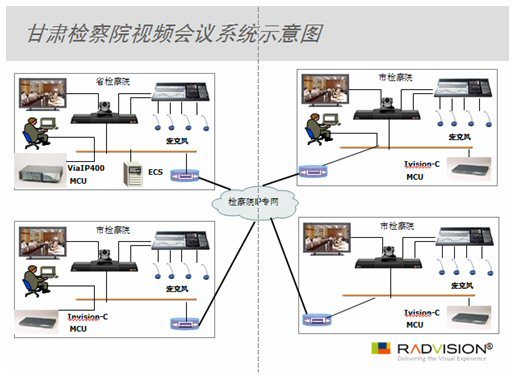 RADVISION為甘肅省檢察院建設的整個視頻會議系統(tǒng)共配置13臺RADVISION MCU系列產品,其中在省級二級網配置一臺viaIP400,在地市級共配置12臺INVISION
