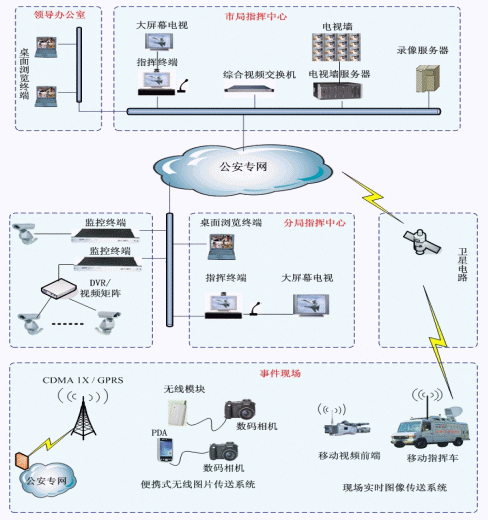 系統分3個層次,市局指揮中心、區(qū)縣分局(交警、消防)指揮中心、移動指揮終端(現場指揮中心),主要設備包括:綜合視頻交換機、指揮終端、監(jiān)控終端、電視墻服務器、存儲錄像服務器、瀏覽終端、移動視頻前端、搞清晰圖片傳輸系統等。系統結構如圖示。