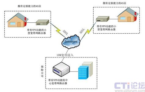 在保險公司數(shù)據(jù)交換控制中心配置一臺具有VPN功能的中心寬帶網(wǎng)路由器,每條ADSL配置一個具有VPN功能的小型寬帶網(wǎng)路由器,并通過設置路由器即可成功建立起VPN網(wǎng)絡。這種網(wǎng)絡結(jié)構(gòu)不但有效的節(jié)約了成本,而且日后系統(tǒng)的擴容的成本也非常的低,每增加一個點只需要申請一條ADSL就可以了。