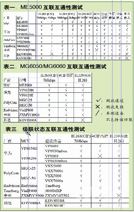 上述3組測試表明,ME5000和MG6050/MG6060能夠與參測的所有產品互聯(lián)互通,并保證絕大部分主流應用的正常運行,這充分肯定了研發(fā)部門所做的工作。其實,在第二組測試中,我們將MG6050/MG6060交由其他MCU管理的同時,也加入了所有視訊終端,以便測試這些廠商之間的互聯(lián)互通性。但測試結果非常不理想,有些甚至無法正常連接。由于缺少這些廠商工程師的支援,我們無法定論它們之間的兼容性問題,但能夠確定的是,前文所提及的H.239雙視頻流傳送、H.264視頻編解碼以及4CIF高清規(guī)格視頻3個特性確實是影響互聯(lián)互通性的關鍵,廠商如果想改善這個現(xiàn)狀,進行針對性研發(fā)是必需的。