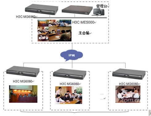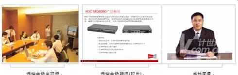 在主會(huì)場,分會(huì)場的會(huì)議室配備H3C高清視訊終端MG6060。H3C MG6060終端支持H.263、H.264等視頻編解碼協(xié)議,并采用了專有的視頻前、后處理技術(shù),使得圖像質(zhì)量大大提升,在周圍環(huán)境光照較差或者會(huì)場顏色搭配不甚和諧的情況下,仍舊能夠得到清晰、自然的圖像。視頻功能主要特色功能包括動(dòng)態(tài)4CIF高清圖像、H.239雙視頻流傳送、畫中畫(PIP)、雙屏顯示、分屏顯示、VGA輸入、VGA輸出、桌面?zhèn)魉汀D像屏蔽、圖像參數(shù)調(diào)整等。有關(guān)H3C