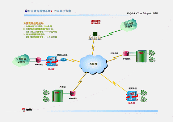 此方案實施后,用戶今后的VoIP分點擴容會十分簡單易行。當用戶有新的分店時,分店的通訊系統(tǒng)可以直接上一臺Polylink eTalk® IA系列i PBX,它既有與PBX相同而且更多的各種功能,還具有VOIP網(wǎng)關(guān)的功能,可直接與總部的IX系統(tǒng)互相注冊,既省掉了多添置一臺語音網(wǎng)關(guān)的成本,也避免了設(shè)備的重復堆壘。