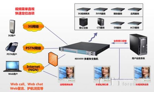 基于毅航通信ISX4000多媒體交換機(jī)的IVVR或視頻呼叫中心系統(tǒng)平臺(tái)可同時(shí)支持3G網(wǎng)絡(luò)、2G以及Internet網(wǎng)絡(luò)的接入;支持視頻、語(yǔ)音、傳真、郵件、短信等全方位服務(wù)模式;支持集中和IP分布式部署,座席數(shù)隨時(shí)隨地任意伸縮,可輕松形成一個(gè)跨區(qū)域、集語(yǔ)音和視頻于一體、統(tǒng)一的視頻呼叫中心系統(tǒng)。