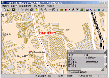 - 地圖維護(hù)功能:提供圖層數(shù)據(jù)管理、空間數(shù)據(jù)管理、圖形編輯管理,系統(tǒng)還提供大量的點(diǎn)、線、區(qū)域的形狀元素,可添加修改點(diǎn)(公安、消防、醫(yī)院等重點(diǎn)單位)、線(道路等)、面(街區(qū)、轄區(qū)等)等地理要素以及對地理要素的名稱、電話號碼等相關(guān)信息進(jìn)行查看與修改。