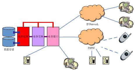其中,業(yè)務接口部分為呼叫中心提供面向服務服務對象(客戶)的連接和面向服務者(座席)的連接接口,業(yè)務交換部分負責在請求服務的對象與提供服務提供者之間建立連接,業(yè)務處理部分負責對這些連接及服務內(nèi)容進行管理和維護,數(shù)據(jù)存儲部分則為所有服務提供必要的數(shù)據(jù)資源和數(shù)據(jù)備份。