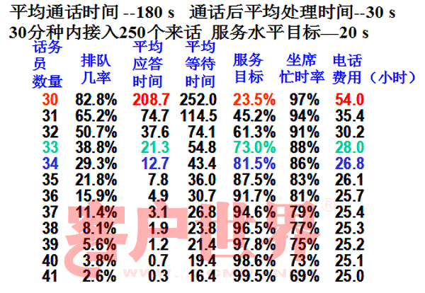 服務水平與通話量、服務時呈反向關系,與座席數(shù)目呈正向關系。為維持目標水平,當通話量、處理時長增加時,就需要增加座席,反之,座席數(shù)目則可以適當減少。