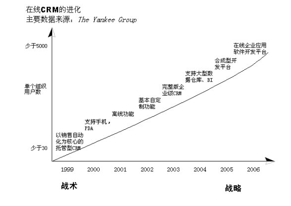 2005年是全球CRM市場發(fā)生天翻地覆變化的一年,CRM市場已達(dá)到120億美元規(guī)模(根據(jù)AMR數(shù)據(jù))。傳統(tǒng)應(yīng)用軟件商們紛紛涉足應(yīng)用軟件托管,但三心二意。傳統(tǒng)應(yīng)用軟件巨頭Siebel,因客戶選擇其托管CRM而通常不會再買其高利潤的傳統(tǒng)CRM產(chǎn)品,其在市場推廣力度和技術(shù)服務(wù)水平上遠(yuǎn)不如Salesforce,Siebel最后被Oracle收購。在Peoplesoft