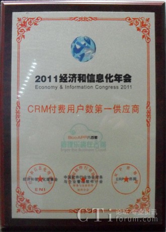 作為全球企業(yè)管理軟件領(lǐng)跑者,八百客參加了此次會(huì)議,并就IT業(yè)戰(zhàn)略性發(fā)展、工業(yè)轉(zhuǎn)型升級(jí)等問題和與會(huì)企業(yè)家進(jìn)行了深入探討,集中、深刻闡釋產(chǎn)業(yè)精髓,洞悉和把握未來發(fā)展方向,尋求最佳的信息化成長(zhǎng)模式。年會(huì)期間的招待晚宴穿插各類年度大獎(jiǎng)的頒獎(jiǎng)典禮,讓與會(huì)的政界、學(xué)界、商界等各路貴賓充分交流信息,建立友誼,為達(dá)成長(zhǎng)期合作奠定良好的基礎(chǔ);诎税倏驮趪鴥(nèi)CRM領(lǐng)域的優(yōu)秀表現(xiàn),本次年會(huì)特別授予了八百客“CRM付費(fèi)用戶數(shù)第一供應(yīng)商”的大獎(jiǎng)。