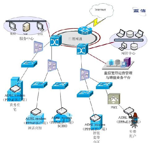 在以以太網(wǎng)技術(shù)為主建設(shè)的運營區(qū)域,在中心由一臺模塊化的核心交換機支持,輔以多臺BASE設(shè)備連接,在接入層用交換機做接入設(shè)備,保證用戶數(shù)據(jù)的快速傳播。在網(wǎng)絡(luò)核心處,部署信利公司的藍(lán)信寬帶認(rèn)證計費系統(tǒng),負(fù)責(zé)對全網(wǎng)用戶的安全認(rèn)證、計費及管理。藍(lán)信寬帶認(rèn)證計費系統(tǒng)除支持標(biāo)準(zhǔn)的RADIUS協(xié)議外,還支持PPPoE、802.1x認(rèn)證。在用戶終端處,部署藍(lán)信特制的PPPoE客戶端,實現(xiàn)撥號上網(wǎng)。