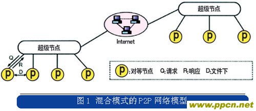 Skype是P2P技術(shù)演進到混合模式后的典型應(yīng)用,它結(jié)合了集中式和分布式的特點,在網(wǎng)絡(luò)的邊緣節(jié)點采用集中式的網(wǎng)絡(luò)結(jié)構(gòu),而在超級節(jié)點之間采用分布式的網(wǎng)絡(luò)結(jié)構(gòu),混合模式的P2P網(wǎng)絡(luò)模型如圖1所示。