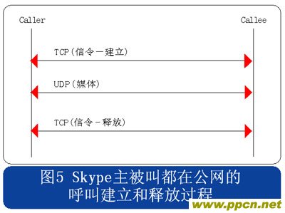 查找到希望連接的用戶后,可以將其加入好友列表,Skype用戶可以隨時與在線的好友進行呼叫。經(jīng)過了稍微復(fù)雜的認證過程和用戶查找過程,呼叫建立和釋放的過程就變得簡單了。用戶位于公網(wǎng)和位于私網(wǎng)內(nèi)部的情況會有所不同,兩種情況下的呼叫建立和釋放流程分別見圖5和圖6所示。