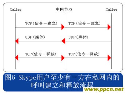 從上述流程圖可見,Skype的呼叫信令都采用TCP封裝,而媒體流則使用UDP封裝,當有任何一方用戶位于限制UDP包的防火墻內(nèi)時,媒體流就會采用TCP封裝。另外當Skype用戶至少有一方位于私網(wǎng)內(nèi)時,所有的信令和媒體消息都經(jīng)過一個或多個中間節(jié)點轉(zhuǎn)發(fā)。此時無需擔(dān)心用戶通話的媒體流因為經(jīng)過中間節(jié)點轉(zhuǎn)發(fā)而被竊聽,因為Skype采用了對消息進行端到端加密的機制。