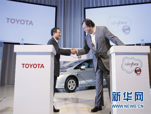 5月23日,日本豐田汽車公司總裁豐田章男(左)和美國(guó)Salesforce.com網(wǎng)站首席執(zhí)行官馬克・貝尼奧夫在東京共同出席新聞發(fā)布會(huì)。