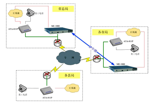 由于用戶數(shù)量較大,我們建議采取分級(jí)管理方式,利用我們Anta科技(北京)有限公司Simplicity 系列IP-PBX產(chǎn)品的靈活性,在每個(gè)市局放置一臺(tái)ME-1000型號(hào)的IP-PBX,管理市局及下屬縣區(qū)局的電話系統(tǒng);省總局放置一臺(tái)ME-1000,管理總局電話系統(tǒng);同時(shí)各市局的ME-1000向總局注冊(cè),形成IP中繼連接,組成全省互通的IP電話管理系統(tǒng)。在終端方面,我們建議采用單端口的ATA-811P桌面型語(yǔ)音網(wǎng)關(guān)連接話機(jī),該網(wǎng)關(guān)通過向IP-PBX注冊(cè),將所有模擬話機(jī)連接到VOIP系統(tǒng)中來。