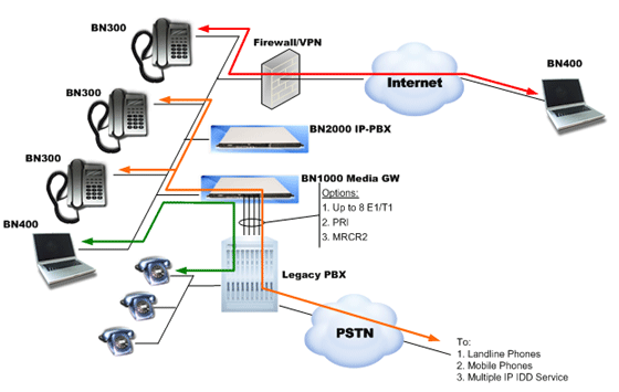 IP-PBX具有強大的動態(tài)路由選擇功能。將BN2000IP-PBX與BN1000網(wǎng)關(guān)配合使用,傳統(tǒng)PBX管轄下的每個模擬電話就會變身為BN300
