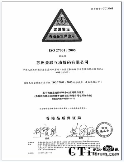蘇州盈聯(lián)通過ISO27001:2005信息安全管理體系認(rèn)證