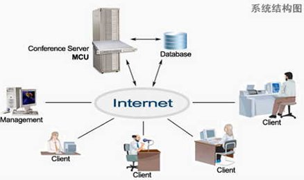 經(jīng)過種種測試,最后選定視維Super-V視頻會(huì)議系統(tǒng),山大聯(lián)潤研發(fā)的視維視頻會(huì)議系統(tǒng)由服務(wù)器端軟件和客戶端軟件兩部分組成。其中安裝服務(wù)器端軟件的PC服務(wù)器必須有公網(wǎng)固定的IP地址;有較好的網(wǎng)絡(luò)帶寬條件,以保證正常的音視頻信號(hào)的傳輸。所有會(huì)議成員都需要在其個(gè)人計(jì)算機(jī)上安裝客戶端軟件,可以根據(jù)具體情況接入IP網(wǎng)絡(luò)。視維Super-V視頻會(huì)議系統(tǒng)將所參會(huì)人員通過IP網(wǎng)絡(luò)連接起來,提供音頻、視頻以及數(shù)據(jù)協(xié)作等通訊服務(wù)。其網(wǎng)絡(luò)拓?fù)鋱D如下:
