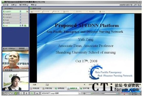 視維視頻會(huì)議系統(tǒng)良好的兼容性,使亞太地區(qū)各成員國(guó)的代表雖遠(yuǎn)隔千山萬(wàn)水,依然可以實(shí)現(xiàn)無(wú)限溝通。視維視頻會(huì)議系統(tǒng)所提供的清晰流暢的音視頻使各成員國(guó)的代表無(wú)需走出國(guó)門(mén),無(wú)需聚到一起,就可以輕松地網(wǎng)絡(luò)面對(duì)面的進(jìn)行交流,既可節(jié)約差旅費(fèi)用,又可避免舟車(chē)勞頓之苦,是各國(guó)代表有更多精力投入到工作中;視維的共享白板、共享文檔、文件下載等強(qiáng)大的數(shù)據(jù)協(xié)作功能可以使各國(guó)代表快速地共享更多的信息、資料,及時(shí)地開(kāi)展越洋培訓(xùn)。近日網(wǎng)絡(luò)面對(duì)面地討論第三屆APEDNN的進(jìn)程及各項(xiàng)議題就是一次典型的應(yīng)用之一,不僅節(jié)約了差旅和時(shí)間成本,而且提高了工作效率,拉近世衛(wèi)各成員國(guó)之間的距離,天涯若比鄰,是各國(guó)代表在工作上更為默契,提高人類(lèi)應(yīng)對(duì)突發(fā)事件與災(zāi)害的能力。
