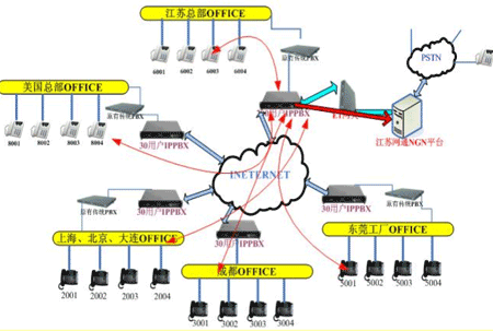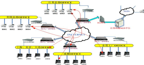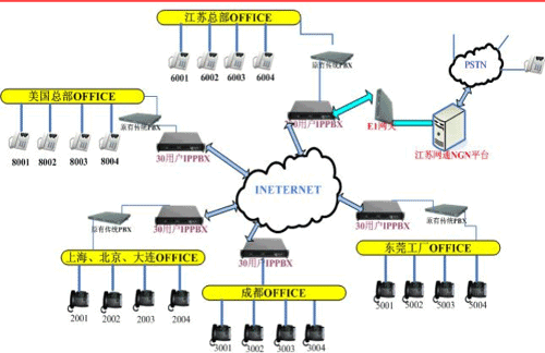 各地的IPPBX會(huì)自動(dòng)識別輸入的號碼,并且通過網(wǎng)絡(luò)把號碼送到蘇州總部的1200交換機(jī),江蘇的1200交換機(jī)已經(jīng)通過E1與江蘇網(wǎng)通的NGN服務(wù)器對接。網(wǎng)通收到你輸入的被叫號碼,即發(fā)出呼叫,完成你的一次呼叫。如果有新辦事處成立,只要有網(wǎng)絡(luò),可不用申請當(dāng)?shù)氐碾娫捑路也可實(shí)現(xiàn)輕松辦公。