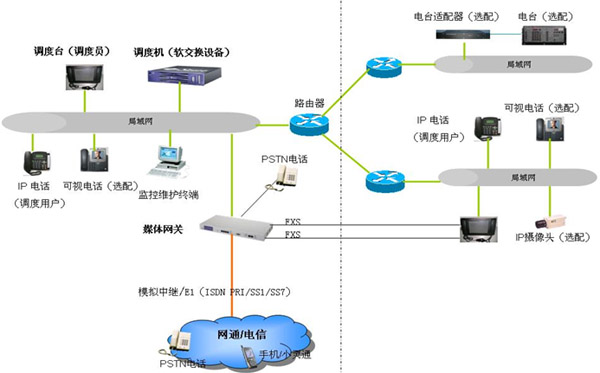IP指揮調(diào)度語音通信系統(tǒng)由調(diào)度機(jī)、調(diào)度臺(tái)、媒體網(wǎng)關(guān)、IP電話、電臺(tái)適配器、電臺(tái)等設(shè)備組成,整體系統(tǒng)采用軟交換網(wǎng)絡(luò)的結(jié)構(gòu),構(gòu)建于以太網(wǎng)之上。傳輸網(wǎng)絡(luò)由通過路由器連接的多個(gè)局域網(wǎng)構(gòu)成;