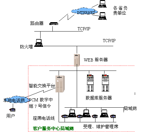 數(shù)據(jù)通信局的客戶遍布全國各地,建立一個覆蓋全國的客戶服務(wù)網(wǎng)絡(luò)勢在必行,因此我公司為之構(gòu)建了數(shù)據(jù)通信局客戶服務(wù)系統(tǒng),全國各地的各個客服中心的數(shù)據(jù)可以通過專線連接,語音也可以通過VOIP用數(shù)字專線連接,以降低長話費(fèi)用。該系統(tǒng)的投入使用,不但滿足了數(shù)據(jù)局為全國各地客戶服務(wù)的需要,而且可以收集客戶信息,不但降低了辦公費(fèi)用,而且有利于擴(kuò)大市場分額。數(shù)據(jù)通信客戶服務(wù)中心的主要目的是解決對全國大客戶的業(yè)務(wù)咨詢與申辦、障礙申告、投訴與建議的集中管理以及處理控制,系統(tǒng)采用800號接入,以一個小型的交換設(shè)備為座席電話分配點(diǎn),客戶撥入的電話,經(jīng)小型交換設(shè)備分配到空閑的座席上。