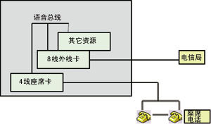 在傳統(tǒng)的語(yǔ)音卡設(shè)計(jì)中,一些語(yǔ)音卡廠商采用一體化設(shè)計(jì),根據(jù)功能的要求,采用通用的分離元件和集成電路自行設(shè)計(jì)電路。采用該類設(shè)計(jì)的語(yǔ)音卡板卡的通道類型、功能、通道數(shù)量在設(shè)計(jì)之初已決定,因而靈活性較差,在構(gòu)成CTI系統(tǒng)時(shí)會(huì)造成通道資源的浪費(fèi)。圖1展示了用此類板卡如何構(gòu)筑一個(gè)8外線+3座席的CTI系統(tǒng),當(dāng)用戶需要增加一個(gè)外線通道時(shí),就需另增加一塊外線卡,投資較大。