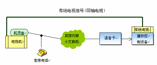 目前,越來越多的星級賓館開通了VOD點(diǎn)播系統(tǒng),從而開展收費(fèi)節(jié)目服務(wù)。該系統(tǒng)可以利用原有的賓館有線電視網(wǎng)絡(luò)和客房電話線來實(shí)現(xiàn),最大限度地利用了原有的設(shè)備,節(jié)省了投資。其系統(tǒng)構(gòu)成如下圖所示: