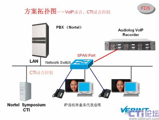 Audiolog錄音系統(tǒng)能和Nortel交換機(jī)、Symposium CTI進(jìn)行整合,獲取CTI隨路數(shù)據(jù)便于用戶(hù)錄音資料檢索。