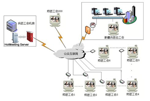 新疆建設(shè)兵團工會下設(shè)有14個師工會,111個團場工會.共有200個用戶同時參加視頻會議。中心服務(wù)器帶寬為100M光纖,各地終端通過網(wǎng)通2M寬帶接入,每個師、團級會場都有自己獨立的機房和會議室,適合進(jìn)行基于IP網(wǎng)絡(luò)視訊會議的應(yīng)用,在這個網(wǎng)絡(luò)平臺上,優(yōu)視(URSACOM)HotMeeting富媒體視頻會議系統(tǒng)所提供的高質(zhì)量的視頻圖像和方便易用的文檔、文件共享功能,使得兵團工會領(lǐng)導(dǎo)能夠在這個平臺上進(jìn)行從桌面討論到會議室正式會議等各種規(guī)模應(yīng)用。通過HotMeeting富媒體視頻會議系統(tǒng),除了進(jìn)行全團工會系統(tǒng)例會,工作交流等常見的應(yīng)用之外,遠(yuǎn)程培訓(xùn)等也是經(jīng)常進(jìn)行的內(nèi)容。各個師、團工會系統(tǒng)能利用數(shù)據(jù)功能和兵團總工會協(xié)調(diào)業(yè)務(wù),也能把平常培訓(xùn)的會議材料進(jìn)行詳細(xì)介紹,節(jié)約了以前培訓(xùn)所花費的大量精力和時間。具體網(wǎng)絡(luò)拓?fù)湟娤聢D: