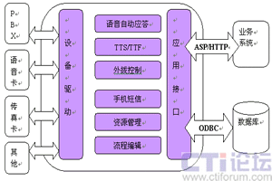 CTI服務器是整個系統(tǒng)的核心,通過內置電話語音/傳真卡,接入PSTN電話網(wǎng)。該服務器可作為一個相對獨立的系統(tǒng)單獨運行,也可以通過企業(yè)局域網(wǎng)與企業(yè)的業(yè)務系統(tǒng)連接。
