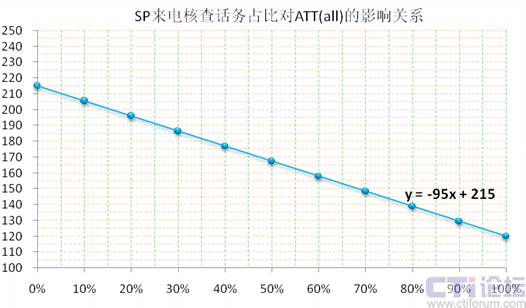 我們把話務構成簡單化,假設只有“來電核查”和“Inbound”兩大隊列,在上下6%的波動范圍內,取ATT(sp)=120秒,ATT(in)=215秒,“SP來電核查”話務占比=x,則“Inbound”話務占比=1-x,ATT(all)=y,整體通話均長y與“SP來電核查”話務占比x存在如下線性關系:(下圖13)