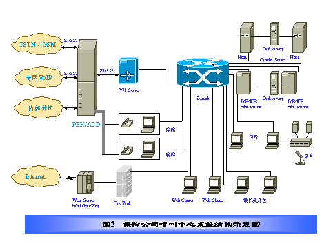 某保險(xiǎn)公司電話中心采取全國(guó)集中服務(wù)方式,其結(jié)構(gòu)如圖2所示,在電話呼叫中心集中管理所有人工語音坐席和電話中心運(yùn)行所需的所有業(yè)務(wù)數(shù)據(jù)、語音文件和硬件設(shè)備,服務(wù)全國(guó)。我們?cè)O(shè)計(jì)的方案具有如下特點(diǎn):