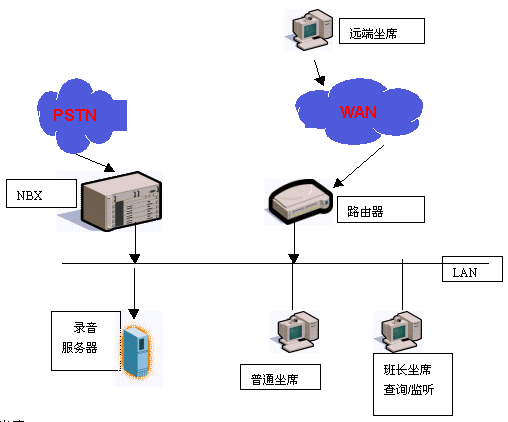 基于3Com NBX呼叫中心的錄音監(jiān)聽系統(tǒng)的拓撲結構圖如下: