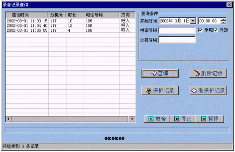根據(jù)該操作員的類別判定該操作員具有那些權限(查詢、管理、監(jiān)聽等),具備查詢權限的操作員可以按時間、分機號、來去點號碼等來查詢所有的錄音信息;具備管理權限的操作員可以進行操作員管理以及對系統(tǒng)相關參數(shù)的設置;具備監(jiān)聽權限的操作員可以監(jiān)聽其他坐席的實時狀態(tài)。